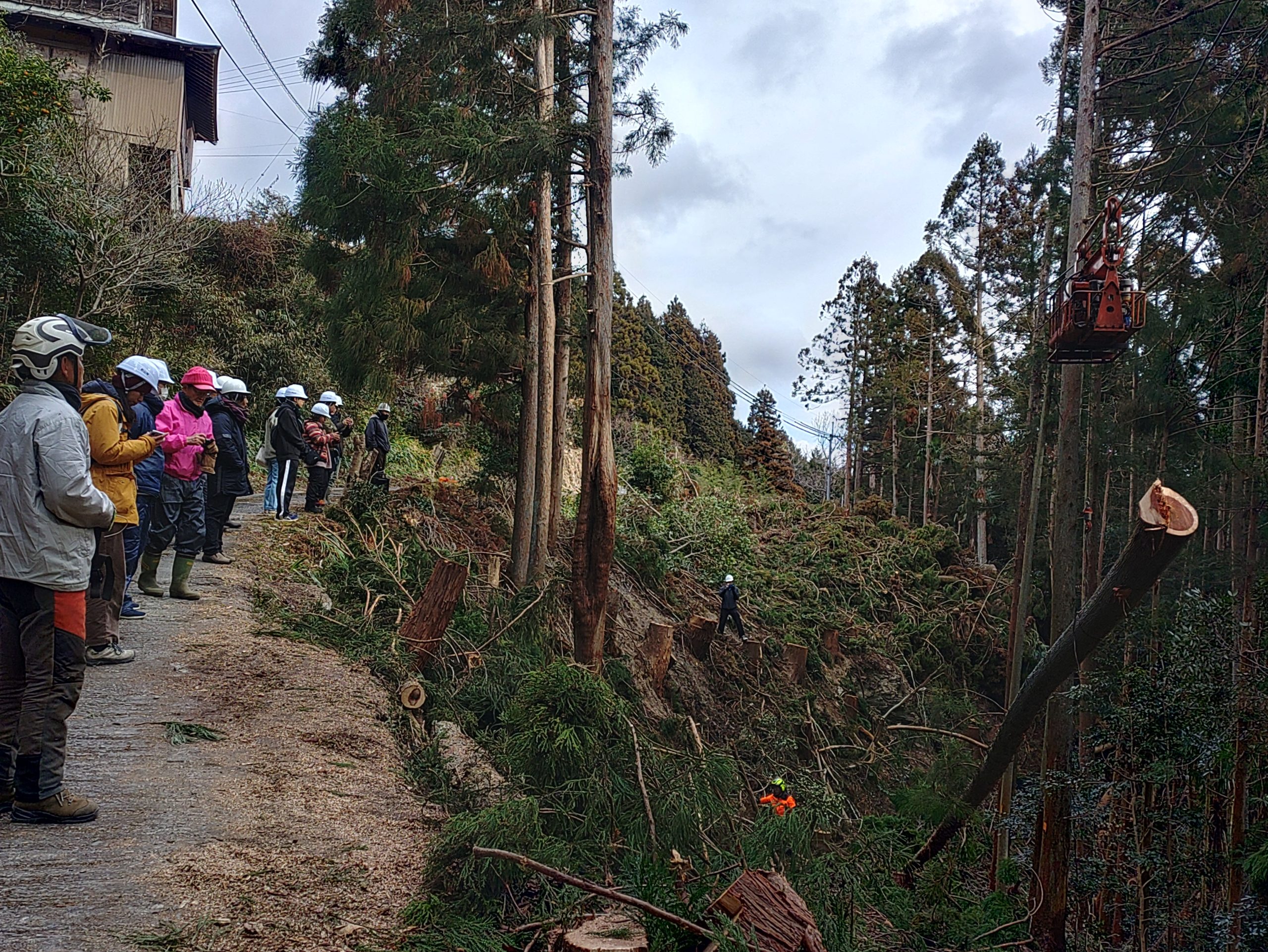 伐採した木を架線で運搬する工程を現地で見学。